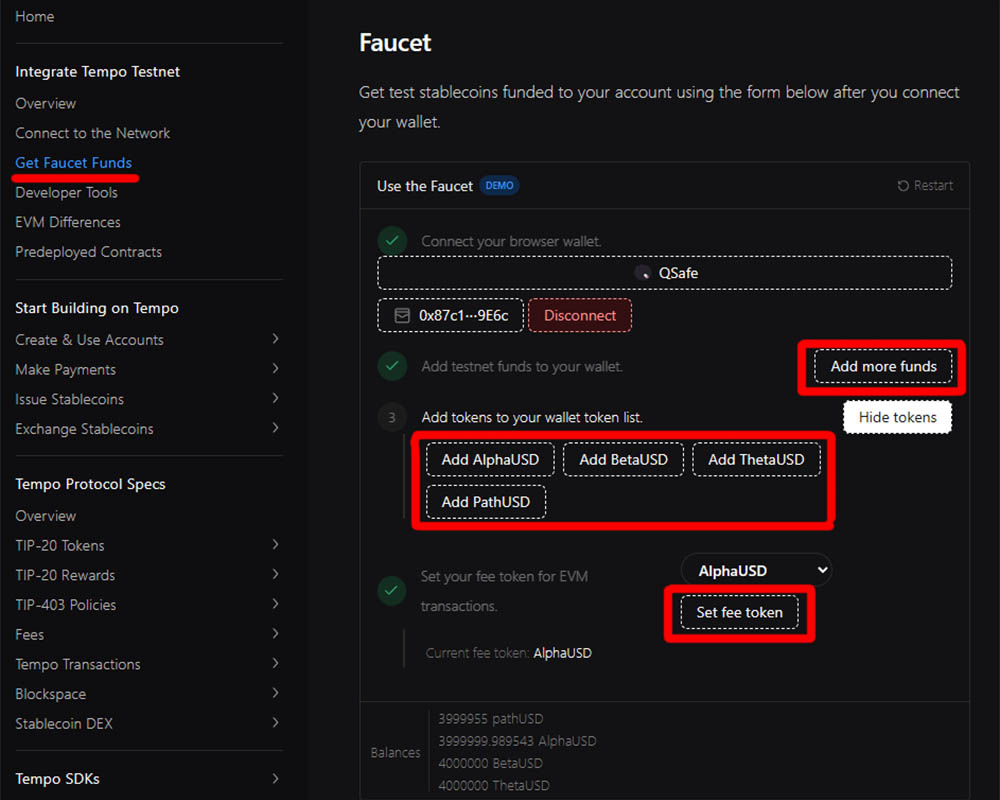 2. Получите тестовые токены, добавьте их в кошелек и выберите токен для оплаты комиссий сети на странице Get Faucet Funds: