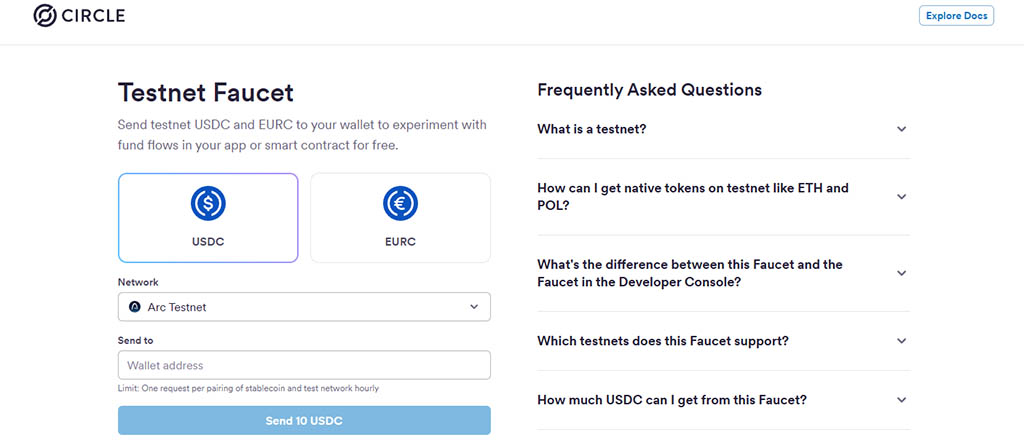 1. Перейдите на страницу Circle Faucet и получите тестовые токены USDC и EURC: