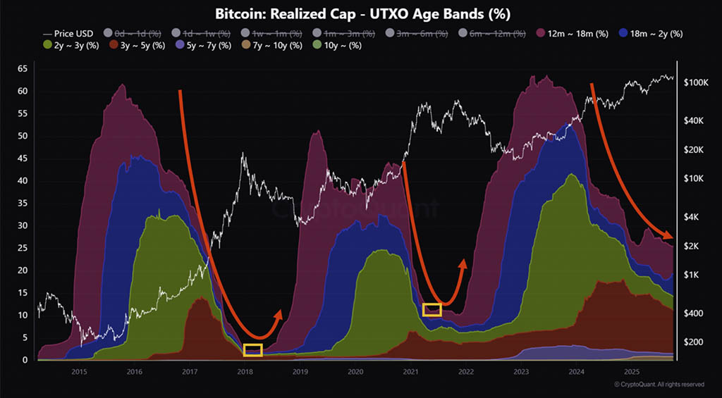 Исторически поздняя стадия бычьего тренда характеризовалась резким падением доли BTC, удерживаемой более года, поскольку ранние инвесторы продавали активы, воспользовавшись ростом, и на рынок прибывал новый капитал. Этот сдвиг обычно сигнализировал о начале перехода от бычьего импульса к ранним стадиям медвежьего цикла.