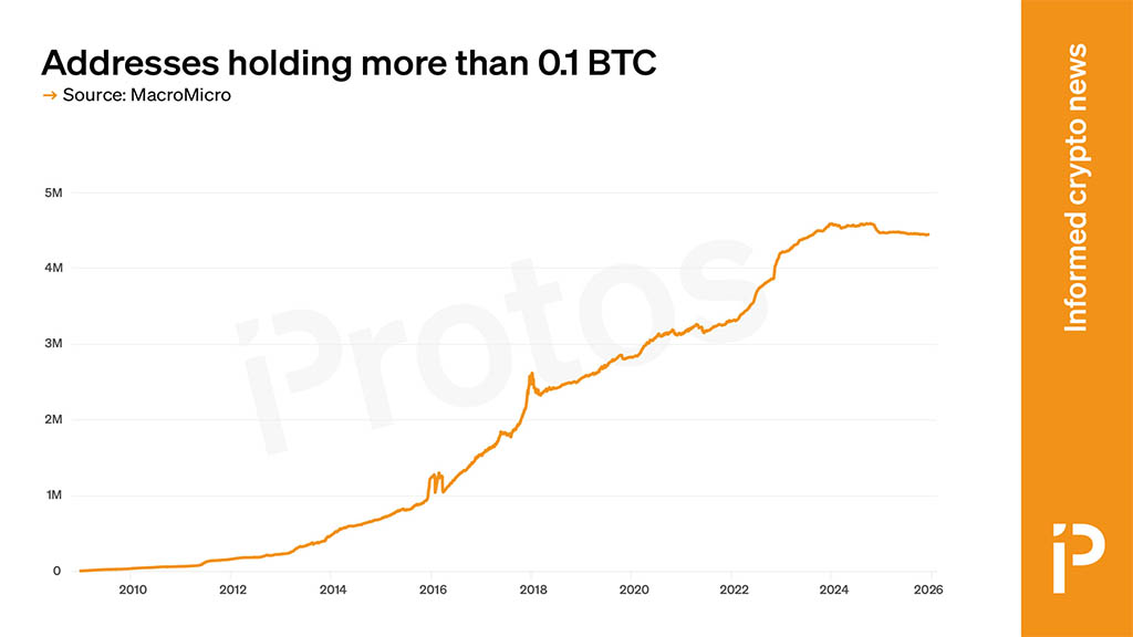 По данным, предоставленным аналитической платформой Protos, количество Bitcoin-адресов, имеющих балансы свыше 0,1 BTC, сократилось за двухлетний период впервые с момента запуска сети криптовалюты в 2009 году.