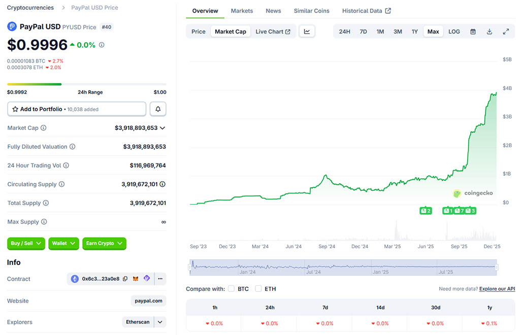 Значительная часть роста PYUSD произошла с начала сентября, когда его рыночная капитализация составляла приблизительно $1 миллиард. В течение этого месяца PYUSD был интегрирован с кредитными рынками Spark и Stable от Bitfinex, блокчейном институционального уровня.