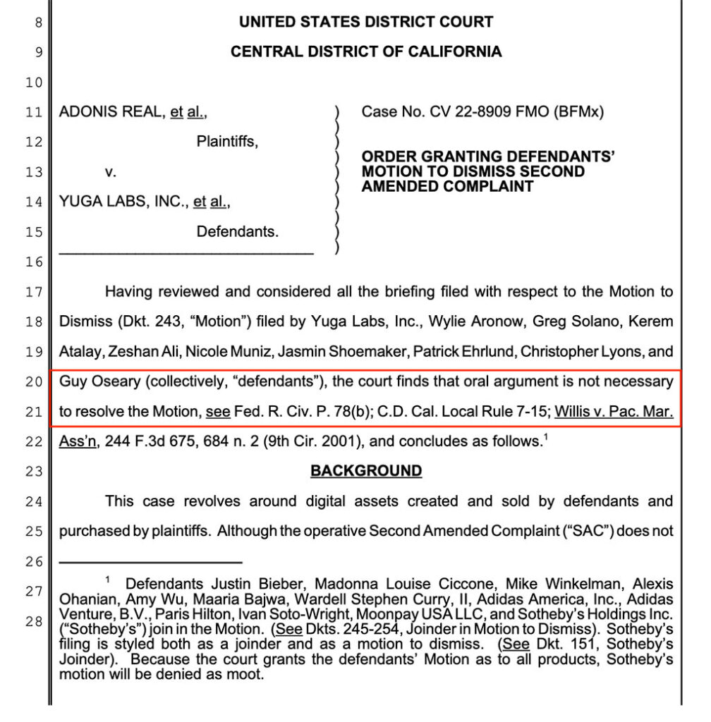 Судья Фернандо М.Олгин постановил, что истцы не продемонстрировали, каким образом Bored Ape Yacht Club (BAYC), ApeCoin или другие NFT, продаваемые Yuga, удовлетворяют трём условиям теста Хауи — стандарта, используемого Комиссией по ценным бумагам и биржам (SEC) для определения того, является ли транзакция инвестиционным контрактом. Иск был подан в 2022 году.