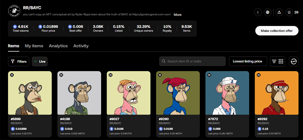 Адвокаты, представляющие интересы Риппса и Кахена, утверждали, что RR/BAYC, впервые выпущенные в мае 2022 года, являются сатирой и пародией на реальную коллекцию Bored Ape Yacht Club и защищены законами о свободе слова.